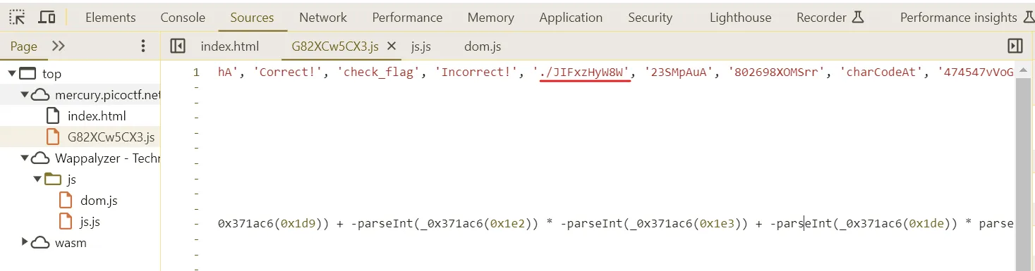 2. 개발자 도구 "Source" “G82XCw5CX3.js”에서 의심스러운 경로(./JIFxzHyW8W) 발견.