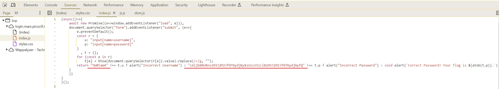 2. 개발자도구 “Source”에서 Base64로 인코딩된 “Username”과 “PW”가 존재.